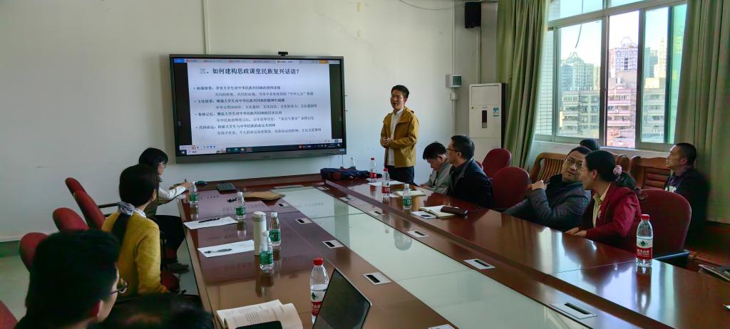 会上,“中国近现代史纲要”教研室的赵蕊博士、“习近平新时代中国特色社会主义思想概论”教研室的曾庆环博士、吴俊青博士,分别就“浅谈人物教学法在《中国近现代史纲要》教学中的应用”“总体国家安全观”“努力建构思政课堂民族复兴话语,加强铸牢当代老员工中华民族共同体意识教育”等主题,结合当前的社会实际和理论前沿问题作了示范性讲授。与会老师结合自己的教学实践与思考,围绕这三个主题的课堂教学进行了热烈讨论。此次备课会为进一步提高教师的课堂教学能力提供了宝贵的经验和启示,取得了良好的效果。